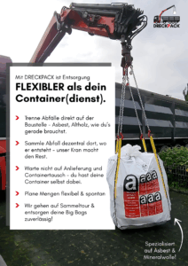 Wir bieten die Entsorgung gefährlicher Abfälle bereits in kleinen Mengen flexibel und kostengünstig an – mit DRECKPACK, einem innovativen Entsorgungskonzept, das auf optimierte Transportwege & Big Bags setzt: